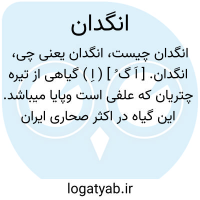 انگدان. [ اَ گ ُ ] ( اِ ) گیاهی از تیره چتریان که علفی است وپایا میباشد. این گیاه در اکثر صحاری ایران فراوان است. ارتفاعش 2 تا 2/5 متر و ریشه اش راست و ستبر است. ابر کبیر. حلتیت. انجدان. ( فرهنگ فارسی معین ). انگذان. معرب آن انجدان است. ( برهان قاطع ):