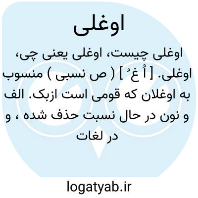 اوغلی. [ اُ غ ُ ] ( ص نسبی ) منسوب به اوغلان که قومی است ازبک. الف و نون در حال نسبت حذف شده، و در لغات ترکی نوشته که اوغلی به معنی پسر او، چه «اوغل » بمعنی پسر و بچه و یای معروف به معنی اوزیرا که ضمیر غایب است. ( غیاث اللغات ) ( آنندراج ).