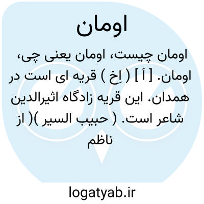 اومان. [ اَ ] ( اِخ ) قریه ای است در همدان. این قریه زادگاه اثیرالدین شاعر است. ( حبیب السیر )( از ناظم الاطباء ) ( برهان ) ( انجمن آرا ) ( آنندراج ).