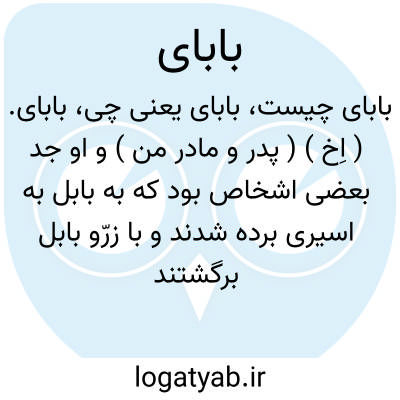 بابای. ( اِخ ) ( پدر و مادر من ) و او جد بعضی اشخاص بود که به بابل به اسیری برده شدند و با زرّو بابل برگشتند ( کتاب عزرا 2:11، کتاب نحمیا 7:16 ) و بیست وهشت تن از بنی بابای با عزرا از بابل مراجعت کردند. ( عزرا 8:11 ) و چهار تن از اینان به اورشلیم رفتند تا با زنان بیگانه تزویج کنند ( عزرا 10:28 ). ( از قاموس کتاب مقدس ).