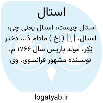 استال. [ اِ ] ( اِخ ) مادام دُ... دختر نِکِر، مولد پاریس سال 1766 م. نویسنده مشهور فرانسوی. وی دارای افکار سیاسی آزادی خواهانه بودو به امر ناپلئون اول تبعید شد و در سال 1817 م. درگذشت. افکار ادبی او مبنای رمانتیسم گردید. او راست:دلفین، کرین، آلمان.