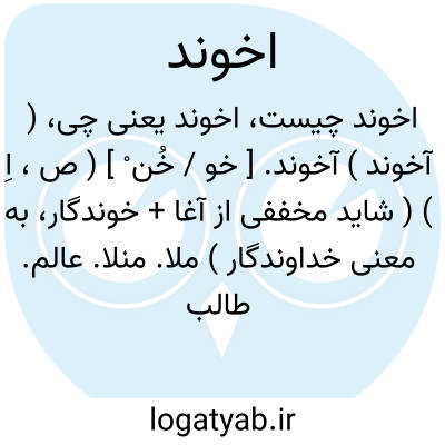 ( آخوند ) آخوند. [ خو / خُن ْ ] ( ص، اِ ) ( شاید مخففی از آغا + خوندگار، به معنی خداوندگار ) ملا. منلا. عالم. طالب علوم دینیه. || مکتب دار کودکان. معلم کُتّاب.