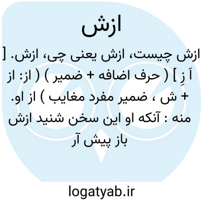 ازش. [ اَ زِ ] ( حرف اضافه + ضمیر ) ( از: از + ش، ضمیر مفرد مغایب ) از او. منه: