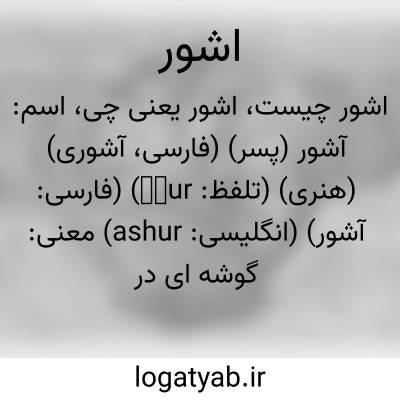 معنی: گوشه ای در دستگاه های ماهور، نوا و راست پنجگاه، رب النوع مورد پرستش مردم کشور آشور، ( در قدیم ) آشوردن، ( اَعلام ) ) نام پسر دومِ سام پسر نوح، ) آسور یا آشور نام سرزمینِ تمدن آشور، برهم زننده، تغییر دهنده، نام دومین فرزند سام که نینوا را بنا نهاد