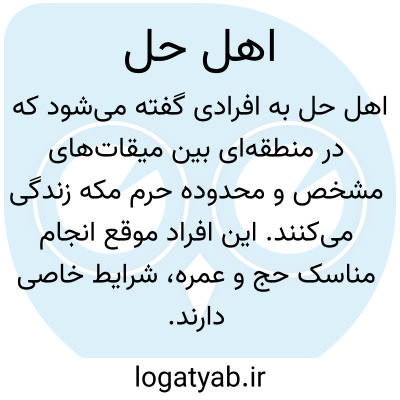[ویکی حج] اهل حِلّ؛ به ساکنان میان میقات های پنج گانه و محدوده حرم گفته می شود. فقهای اسلامی برای ساکنان حل در مورد میقات، طواف وداع، انجام حج و عبور از منازل، احکام خاصی قائل هستند. میقات اهل حل منازل آنهاست البته بهتر است که از مواقیت احرام ببندند. مشهور فقیهان امامی بر آنند که انجام حج تمتع برای ساکنان مکه و پیرامون آن روا نیست.