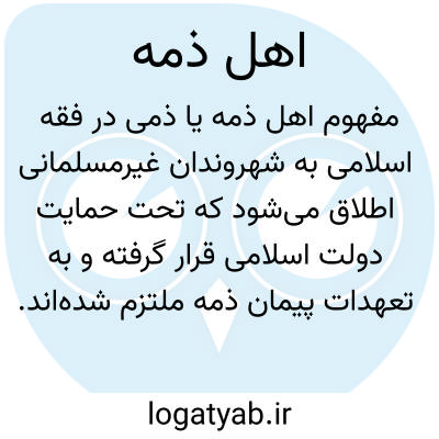 ذمه به معنای عهد و پیمان است و مقصود از اهل ذمه آن گروه از اهل کتاب اند که تحت حمایت حکومت اسلامی با پرداختن مالیاتی به نام جزیه با مسلمانان عهد و پیمان بسته اند و براساس شرایط و تعهدات خاصی در سرزمین های مسلمانان زندگی می کنند. در این مدخل از واژه «جزیه» و «حبل من الناس» استفاده شده است.