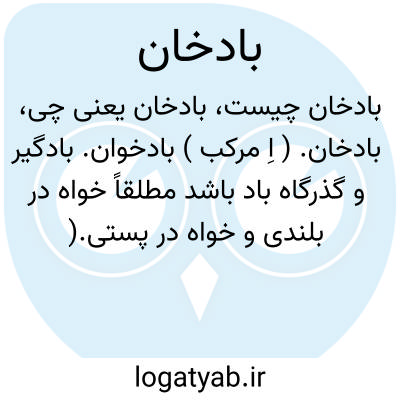 بادخان. ( اِ مرکب ) بادخوان. بادگیر و گذرگاه باد باشد مطلقاً خواه در بلندی و خواه در پستی.( برهان ) ( ناظم الاطباء ). جای بادگزار[ گذار ] و ظاهراً باصطلاح مکان اسفل را گویند و در اصل خانه باد بود که بقلب استعمال کرده اند. کسائی گوید: