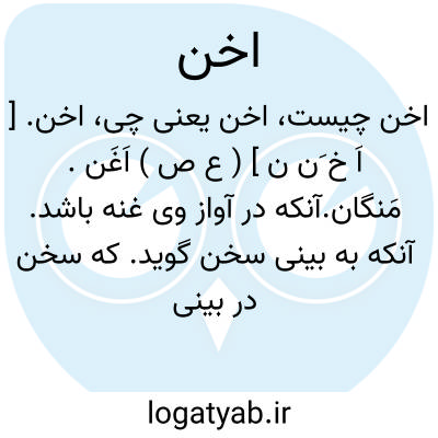 اخن. [ اَ خ َن ن ] ( ع ص ) اَغَن. مَنگان.آنکه در آواز وی غنه باشد. آنکه به بینی سخن گوید. که سخن در بینی گوید. که سخن به بینی گوید. ( مهذب الاسماء ). در بینی سخن کننده. مؤنث: خَنّاء. ج، خُن.