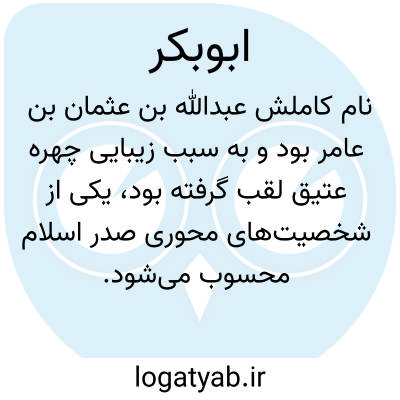 معنی: نام خلیفه اول و جانشین پیامبر ( ص ) و پدر عایشه همسر پیامبر ( ص )، پدر بَکر، ( اَعلام ) ) ابوبکر: ( = عبدالله ابن ابی قحافه ) [قرن اول هجری] نخستین خلیفه از خلفای راشدین [، قمری] و از یاران نزدیک پیامبر اسلام ( ص )، ملقب به صدّیق، ) ابوبکر: سومین اتابک لر کوچک [اوایل قرن هجری]، ) ابوبکر ابن سعد: ششمین اتابک [، قمری] از اتابکان زنگی فارس، پسر سعد ابن زنگی که سعدی گلستان و بوستان را به نام او تألیف کرده است، ) ابوبکر سیف الدین: ( = ملک عادل دوم ) شاه ایوبی مصر [، قمری]، که برادرش ملک صالح بر او شورید و او را خلع کرد، ) ابوبکر عبدالله ابن عمر بلخی: [زنده در قمری] واعظ اهل بلخ، مؤلف کتابی عربی به نام فضایل بلخ، درباره ی ویژگیهای بلخ همراه با زندگینامه ی عده ای از بزرگان و فضلای بلخ تا قرن هجری، ) ابوبکر عبدالله ابن محمّد رازی: ( = نجم الدین دایه )، ی نجم الدین، ) ابوبکر محمّدابن عبدالکریم: ( ؟ ) از جانشینان شیخ مرشد، صوفی ایرانی، مؤلف کتاب عربی در شرح حال او که بعدها محمود ابن عثمان فردوس المرشدیه را با اقتباس از آن تألیف کرد، ) ابوبکر محیی الدین محمّد: ( = ابن عربی )، ا محیی الدین، ( عربی ) ( در اعلام ) نام خلیفه ی اول بعد از وفات حضرت محمد ( ص ) و نام فرزند امام حسن ( ع )