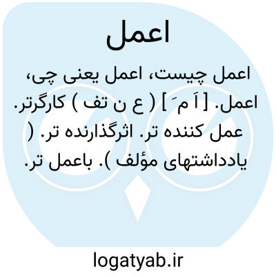 اعمل. [ اَ م َ ] ( ع ن تف ) کارگرتر. عمل کننده تر. اثرگذارنده تر. ( یادداشتهای مؤلف ). باعمل تر. مؤثرتر. کارگرتر. ( ناظم الاطباء ): و لم ار شیئاً من الادویة المسهلة الحادة اعمل فی اوجاع المرة السوداء منه [من الحنظل ]. ( ابن البیطار ).