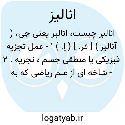 ( آنالیز ) [ فر. ] ( اِ. ) ۱ - عمل تجزیه فیزیکی یا منطقی جسم، تجزیه. ۲ - شاخه ای از علم ریاضی که به مطالعة رفتار توابع از نظر حد و پیوستگی و مشتق پذیری و غیره می پردازد. ۳ - فهرست بندی داده های یک مسئله و داده های دیگر مربوط به آن و سپس جست و جوی هدف با مشخص کردن