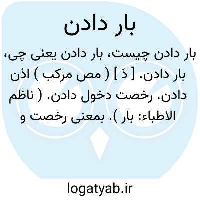 بار دادن. [ دَ ] ( مص مرکب ) اذن دادن. رخصت دخول دادن. ( ناظم الاطباء: بار ). بمعنی رخصت و دستوری. ( آنندراج: بارداد ). رخصت دخول دادن. اذن دخول دادن. اجازه درآمدن دادن. دستوری ورود دادن. اجازه ورود دادن. اجازه دخول ببارگاه دادن. اجازه ورود به نزد شاهی یا بزرگی دادن. پذیرفتن شاهی یا امیری چاکران را. پذیرفتن در بارگاه. بار عام دادن. رجوع به شعوری ج 1 ورق 126 شود:
