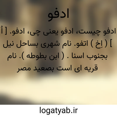 ادفو. [ اُ ] ( اِخ ) اتفو. نام شهری بساحل نیل بجنوب اسنا. ( ابن بطوطه ). نام قریه ای است بصعید مصر اعلی بین اسوان و قوص و نخل بسیار و دارای خرمائی است که از بس شیرینی کس بخوردن آن قادر نیست مگرآنکه مانند شکر در هاون بکوبند و بر عصاید پاشند. واز آنجاست ابوبکر محمدبن علی الأدفوی، ادیب مقری مصاحب نحّاس. او راست کتابی در تفسیر قرآن مجید در پنج مجلد بزرگ و کتب ادب دیگر و ترجمه او در معجم الادباء آمده است. ( معجم البلدان ). ادفو قصبه ای است کوچک به دومیلی ساحل یسار رود نیل به 106 هزارگزی شمالی اسوان. سکنه آن 20000 تن است و مرکز قضائی است و آن در قدیم شهری بزرگ بوده است و مصریان قدیم آنرا اطبو می نامیدند و یونانیان اپولونیوپولیس بزرگ می خواندند.ویرانه های شهر قدیم اکنون دیده می شود، و رصیف زیبائی از شهر قدیم هم اکنون بر ساحل نیل برجایست و دو معبد قدیم آن شهر نیز موجود است و این دو معبد به ستونها و هیکل ها و خطوط هیروگلیف ( خط وحوش ) مزین است و هرچند این آثار یکی از اجله اثرهای قدیم مصر است لکن بسیار کهن و قدیمی نیست. بناء این معابد بروزگار بطالسه شده است و دلیل است که تا زمان بطلمیوسها صنایع و مدنیت قدیم مصر هنوز بر قوت خویش بوده است و ابوبکر محمدبن علی ادفوی صاحب تفسیر معروف در پنج مجلد و کتب ادبیه دیگر از مردم آنجاست. ( قاموس الاعلام ترکی ). و رجوع به ضمیمه معجم البلدان شود. || قریه ای است بمصر از کورةالبحیرة. ( معجم البلدان ). || دهی است نزدیک اسکندریه. ( منتهی الارب ).