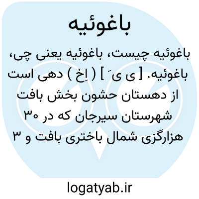 باغوئیه. [ ی ی َ ] ( اِخ ) دهی است از دهستان حشون بخش بافت شهرستان سیرجان که در 30 هزارگزی شمال باختری بافت و 3 هزارگزی شمال راه فرعی بافت به سیرجان واقع است و 15 تن سکنه دارد. ( از فرهنگ جغرافیایی ایران ج 8 ).