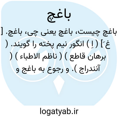 باغچ. [ غ َ] ( اِ ) انگور نیم پخته را گویند. ( برهان قاطع ) ( ناظم الاطباء ) ( آنندراج ). و رجوع به باغج و باغنج شود.