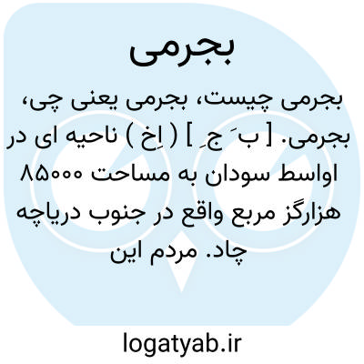 بجرمی. [ ب َ ج ِ ] ( اِخ ) ناحیه ای در اواسط سودان به مساحت 85000 هزارگز مربع واقع در جنوب دریاچه چاد. مردم این ناحیه را بجارمه گویند که حوالی 300 سال پیش بوسیله قبائل فلبه اسلام پذیرفتند. ( از اعلام المنجد ). بقیرمی. بگیرمی.