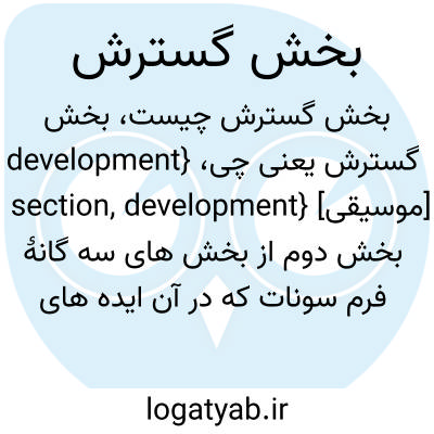 {development section, development} [موسیقی] بخش دوم از بخش های سه گانۀ فرم سونات که در آن ایده های مطرح شده در بخش نخست پرورانده می شود متـ. گسترش