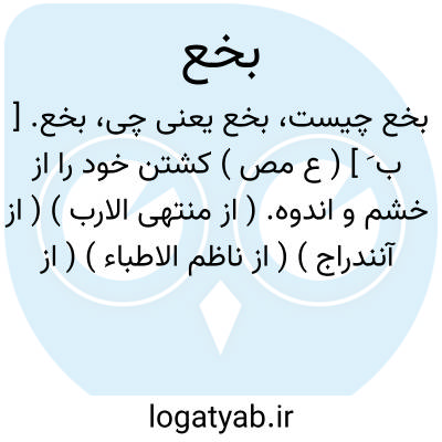 بخع. [ ب َ ] ( ع مص ) کشتن خود را از خشم و اندوه. ( از منتهی الارب ) ( از آنندراج ) ( از ناظم الاطباء ) ( از اقرب الموارد ). هلاک کردن بغم. هلاک کردن خود را. ( ترجمان القرآن جرجانی ترتیب عادل بن علی ). هلاک کردن. ( تاج المصادر بیهقی ): بخع نفسه بخعاً. ( ناظم الاطباء ). || کندن چاه را تا برآمدن آب. ( از منتهی الارب ) ( ناظم الاطباء ) ( از آنندراج ) ( از ذیل اقرب الموارد ): بخع الرکیة؛ کند چاه را تا آب برآمد. ( ناظم الاطباء ). || پند بی آمیغ دادن کسی را و مبالغه کردن در آن. ( از منتهی الارب ) ( از ناظم الاطباء ) ( از آنندراج ). صادقانه نصیحت کردن. ( از ذیل اقرب الموارد ): بخع له؛ نصحه. ( ناظم الاطباء ). || پیاپی کاشتن زمین را و سالی آن را بی کشت و زراعت نگذاشتن. ( از منتهی الارب ) ( از ناظم الاطباء ) ( از آنندراج ) ( ناظم الاطباء ) ( از اقرب الموارد ). منه حدیث عایشة فی صفة عمر رضی اﷲ عنهما: بخع الارض فقأت اکلها؛ ای قهر اهلها و اذلهم و اخرج ما فیها من الکنوز و اموال الملوک. ( منتهی الارب ) ( ناظم الاطباء ). || تصدیق کردن خبر کسی را. ( از منتهی الارب ) ( از ناظم الاطباء ) ( آنندراج ) ( از ذیل اقرب الموارد ): بخع فلاناً؛ خبره. ( ناظم الاطباء ). || مبالغه کردن در ذبح گوسفند بحدی که از حد ذبح درگذرد و به رگ بخاع رسد. این اصل معنی کلمه است، پس از آن در هر مبالغه بکار رفته است. ( از منتهی الارب ) ( از ناظم الاطباء ) ( از آنندراج ) ( از اقرب الموارد ).