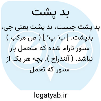 بدپشت. [ ب َ پ ُ ] ( ص مرکب ) ستور نارام شده که متحمل بار نباشد. ( آنندراج ). بچه هر یک از ستور که تحمل بار نداشته باشد. ( ناظم الاطباء ).