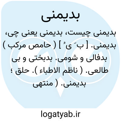 بدیمنی. [ ب َ ی ُ ] ( حامص مرکب ) بدفالی و شومی. بدبختی و بی طالعی. ( ناظم الاطباء ). حلق؛ بدیمنی. ( منتهی الارب ).
