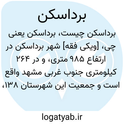 [ویکی فقه] شهر برداسکن در ارتفاع ۹۸۵ متری، و در ۲۶۴ کیلومتری جنوب غربی مشهد واقع است و جمعیت این شهرستان ۱۳۸، ۱۴ تن می باشد.