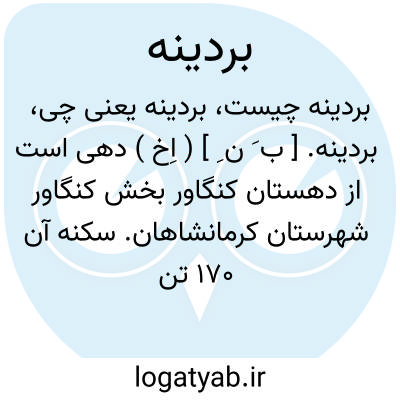 بردینه. [ ب َ ن ِ ] ( اِخ ) دهی است از دهستان کنگاور بخش کنگاور شهرستان کرمانشاهان. سکنه آن 170 تن است. ( از فرهنگ جغرافیایی ایران ج 5 ).