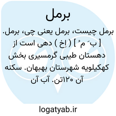 برمل. [ ب َ م ُ ] ( اِخ ) دهی است از دهستان طیبی گرمسیری بخش کهکیلویه شهرستان بهبهان. سکنه آن 120تن. آب آن از چشمه و رودخانه و محصول آن غلات، برنج،پشم و لبنیات است. ( از فرهنگجغرافیایی ایران ج 6 ).