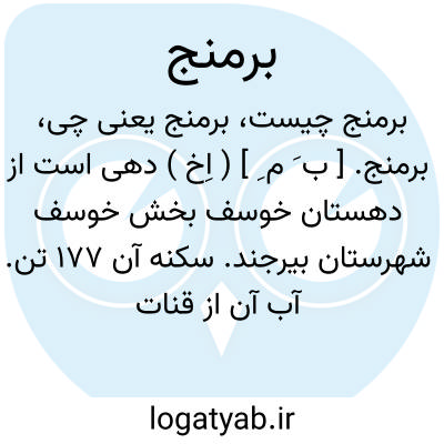 برمنج. [ ب َ م ِ ] ( اِخ ) دهی است از دهستان خوسف بخش خوسف شهرستان بیرجند. سکنه آن 177 تن. آب آن از قنات ومحصول آن غلات است. ( از فرهنگجغرافیایی ایران ج 9 ).