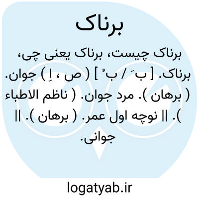 برناک. [ ب َ / ب ُ ] ( ص، اِ ) جوان. ( برهان ). مرد جوان. ( ناظم الاطباء ). || نوچه اول عمر. ( برهان ). || جوانی. ( ناظم الاطباء ). || حنای دست و پا. ( برهان ). برنا. رجوع به برنا شود. || آبدست خانه. ( ناظم الاطباء ).