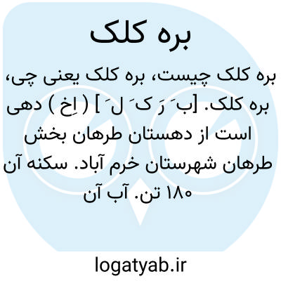 بره کلک. [ب َ رَ ک َ ل َ ] ( اِخ ) دهی است از دهستان طرهان بخش طرهان شهرستان خرم آباد. سکنه آن 180 تن. آب آن از چاه و محصول آن غلات و لبنیات است. ساکنان این ده از طایفه گرمه می باشند. ( از فرهنگجغرافیایی ایران ج 6 ).