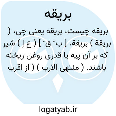 ( بریقة ) بریقة. [ ب َ ق َ ] ( ع اِ ) شیر که بر آن پیه یا قدری روغن ریخته باشند. ( منتهی الارب ) ( از اقرب الموارد ). طعامی است که از شیر و روغن کنند. ( بحر الجواهر ). ج، بَرائق. ( اقرب الموارد ) ( منتهی الارب ).