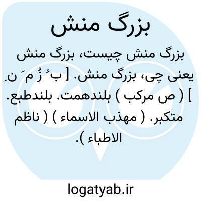 بزرگ منش. [ ب ُ زُ م َ ن ِ ] ( ص مرکب ) بلندهمت. بلندطبع. متکبر. ( مهذب الاسماء ) ( ناظم الاطباء ). مختال. منیع. ابلخ.بَلخ. بطر. و در تداول، آنکه آثار بزرگی نفس از او هویداست: دوم صورت [ از صور جنوبی فلکی ] صورت جبار، ای بزرگ منش. ( التفهیم ). میان اتباع او [ شیر ] دو شگال بودند یکی را کلیله نام و دیگری را دمنه و هر دو ذکای تمام داشتند و لیکن دمنه حریص تر بودو بزرگ منش تر. ( کلیله و دمنه ). || معجب. خویشتن بین. بطر. ( یادداشت مؤلف ). خودخواه. جاه طلب.