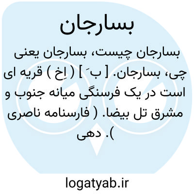 بسارجان. [ ب َ ] ( اِخ ) قریه ای است در یک فرسنگی میانه جنوب و مشرق تل بیضا. ( فارسنامه ناصری ). دهی است ازدهستان بیضا بخش اردکان شهرستان شیراز که در 62 هزارگزی جنوب خاور اردکان و هفت هزارگزی راه فرعی زرقان به بیضا در جلگه قرار دارد. هوایش معتدل با 212 تن سکنه، آبش از قنات و محصولش غلات، برنج، چغندر و شغل مردمش زراعت است. ( از فرهنگ جغرافیایی ایران ج 7 ).