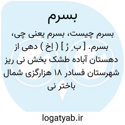 بسرم. [ ب ِ رُ ] ( اِخ ) دهی از دهستان آباده طشک بخش نی ریز شهرستان فسادر 18 هزارگزی شمال باختر نی ریز، کنار راه فرعی نی ریز به آباده طشک. ( از فرهنگ جغرافیایی ایران ج 7 ).