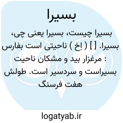 بسیرا. [ ] ( اِخ ) ناحیتی است بفارس: مرغزار بید و مشکان ناحیت بسیراست و سردسیر است. طولش هفت فرسنگ در عرض سه فرسنگ و علفزار عظیم دارد. ( نزهةالقلوب چ 1331 هَ. ق. لیدن ص 135 ). مرغزار بید و مشکان، مرغزار نیکو است و ناحیتی است آنجا بسیرا گویند سردسیر است. طول آن هفت فرسنگ در عرض سه فرسنگ. ( فارسنامه ابن البلخی چ 1339 هَ. ق. کمبریج ص 155 ). کمه و فاروق و بسیرا شهرکی است و دیههاء بزرگ و نواحی و هوای آن سرد است معتدل و آبهای روان خوش دارد و میوه ها باشد از هر نوعی و نخجیرگاه است و همه آبادانست و بحومه آن جامع و منبر است. ( فارسنامه ابن البلخی چ 1339 هَ. ق. کمبریج ص 125 ).