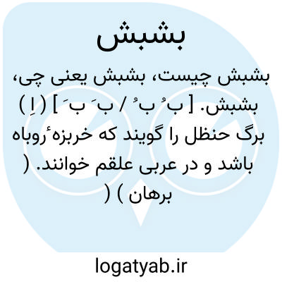 بشبش. [ ب ُ ب ُ / ب َ ب َ ] ( اِ ) برگ حنظل را گویند که خربزه ٔروباه باشد و در عربی علقم خوانند. ( برهان ) ( آنندراج ). برگ حنظل. ( ناظم الاطباء ) ( دزی ج 1 ص 88 ) ( مفردات ابن بیطار ). اسم برگ حنظل است. ( تحفه حکیم مؤمن ).