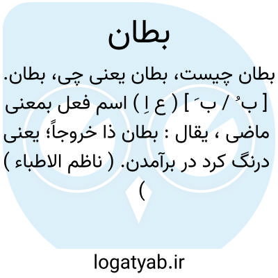 بطان. [ ب ِ ] ( ع اِ ) بزماده. ( ناظم الاطباء ). بز ماده است بد. ( منتهی الارب ). || اسپی است که آنرا ابوالبطین هم گفتندی و آن هر دو مر محمدبن ولیدبن عبدالملک را بود. ( منتهی الارب ). || تنگ ستور. منه المثل: التقت حلقتا البطان، وقتی گویندکه کار سخت دشوار گردد. ج، اَبْطِنَه. و بُطُن. ( منتهی الارب ) ( ناظم الاطباء ). تنگ پالان ستور. ( آنندراج ).