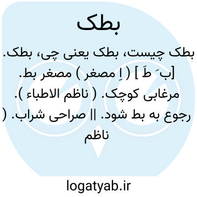 بطک. [ب َ طَ ] ( اِ مصغر ) مصغر بط. مرغابی کوچک. ( ناظم الاطباء ). رجوع به بط شود. || صراحی شراب. ( ناظم الاطباء ). صراحی کوچک که برای شراب سازند. ( غیاث ) ( آنندراج ). جامی که بشکل بطساخته شده باشد. ( ناظم الاطباء ). و رجوع به بط شود.