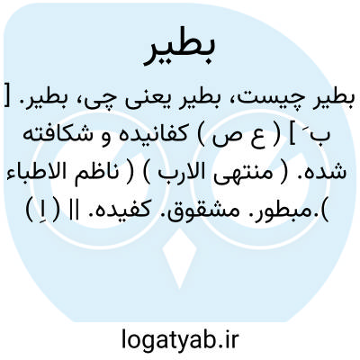 بطیر. [ ب َ ] ( ع ص ) کفانیده و شکافته شده. ( منتهی الارب ) ( ناظم الاطباء ).مبطور. مشقوق. کفیده. || ( اِ ) پچشک ستور.( منتهی الارب ). پزشک ستور. ( ناظم الاطباء ). دام پزشک.