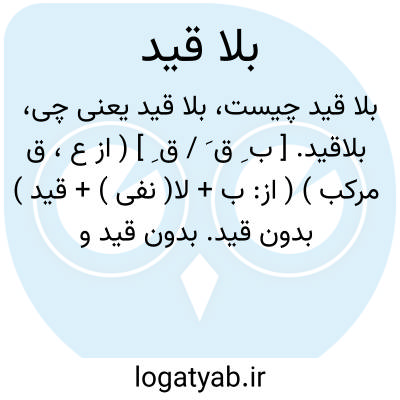 بلاقید. [ ب ِ ق َ / ق ِ ] ( از ع، ق مرکب ) ( از: ب + لا( نفی ) + قید ) بدون قید. بدون قید و شرط. ( فرهنگ فارسی معین ). مطلقاً: در نسخه ای که بر رسومات نوشته اند رسوم رادر تحت امیر آخورباشی مجملاً - بلاقید «جلو» و «صحرا»- تفصیل داده اند. ( تذکرةالملوک چ دبیرسیاقی ص 54 ).