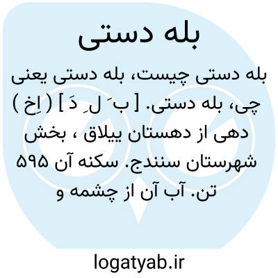 بله دستی. [ ب َ ل ِ دَ ] ( اِخ ) دهی از دهستان ییلاق، بخش شهرستان سنندج. سکنه آن 595 تن. آب آن از چشمه و محصول آن غلات است. ( از فرهنگ جغرافیایی ایران ج 5 ).