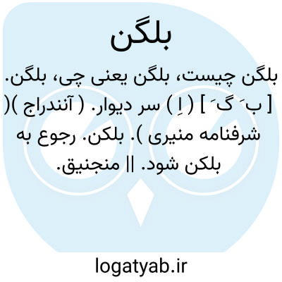 بلگن. [ ب َ گ َ ] ( اِ ) سر دیوار. ( آنندراج )( شرفنامه منیری ). بلکن. رجوع به بلکن شود. || منجنیق. ( آنندراج ). بلکن. رجوع به بلکن شود.