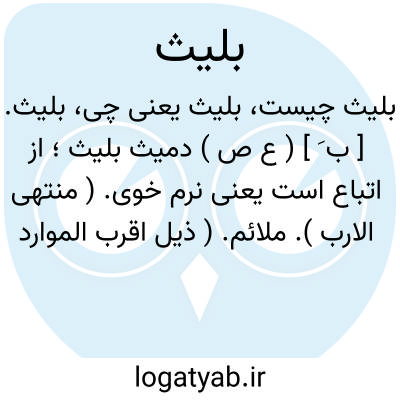 بلیث. [ ب َ ] ( ع ص ) دمیث بلیث؛ از اتباع است یعنی نرم خوی. ( منتهی الارب ). ملائم. ( ذیل اقرب الموارد از تاج ). || ( اِ ) علف ریزه خشک دوساله که سیاه گردیده باشد. ( منتهی الارب ).