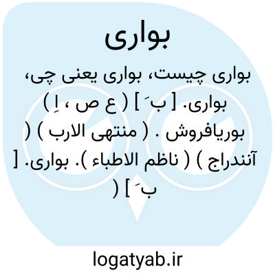 لغت نامه دهخدا بواری. [ ب َ ] ( ع ص، اِ ) بوریافروش. ( منتهی الارب ) ( آنندراج ) ( ناظم الاطباء ).بواری. [ ب َ ] ( ع ص نسبی ) نسبتی است به بوریا که حصیر باشد. ( الانساب سمعانی ).بواری. [ ب َ ] ( اِخ ) لقب حسن بن الربیع شیخ بخاری و مسلم. ( منتهی الارب ) ( از لباب الانساب ) ( آنندراج ).