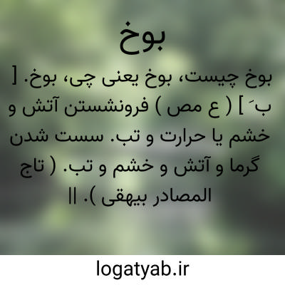 بوخ. [ ب َ ] ( ع مص ) فرونشستن آتش و خشم یا حرارت و تب. سست شدن گرما و آتش و خشم و تب. ( تاج المصادر بیهقی ). || مانده شدن کسی. ( از منتهی الارب ) ( آنندراج ) ( ناظم الاطباء ) ( از اقرب الموارد ). بماندن. ( تاج المصادر بیهقی ). || پدید آمدن راز و یعدی بالباء. ( المصادر زوزنی چ بینش ص 63 ).