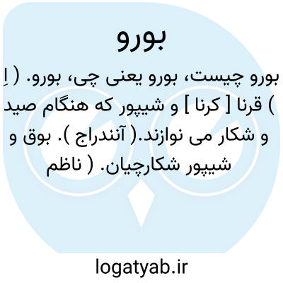 بورو. ( اِ ) قرنا [ کرنا ] و شیپور که هنگام صید و شکار می نوازند.( آنندراج ). بوق و شیپور شکارچیان. ( ناظم الاطباء ).