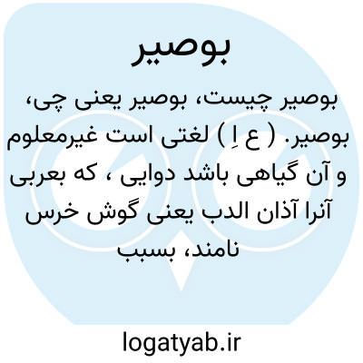 بوصیر. ( ع اِ ) لغتی است غیرمعلوم و آن گیاهی باشد دوایی، که بعربی آنرا آذان الدب یعنی گوش خرس نامند، بسبب شباهتی که بدان دارد. و بعضی گویند: نوعی از ماهی زهره است و آن پوست درختی باشد بغایت سیاه و آنرا بعربی شیکران الحوت گویند و بعضی دگر گفته اند: باقلای شامی است واﷲ اعلم. ( برهان ). نباتی است. ( منتهی الارب ) ( آنندراج ) ( ناظم الاطباء ). قسمی از شوکران. ( ناظم الاطباء ). جورتاق. بربشکة. سیکران الحوت. اقنقن. فلومس. ( یادداشت بخط مولف ). رجوع به بوسیر شود.