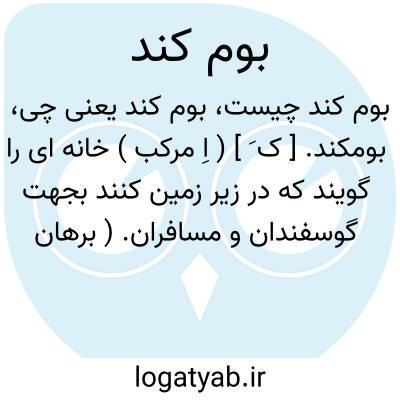 بومکند. [ ک َ ] ( اِ مرکب ) خانه ای را گویند که در زیر زمین کنند بجهت گوسفندان و مسافران. ( برهان ) ( آنندراج ) ( انجمن آرا ) ( ناظم الاطباء ). جایی که در زیر زمین کنند بجهت مسافران و گوسفندان. ( فرهنگ فارسی معین ).