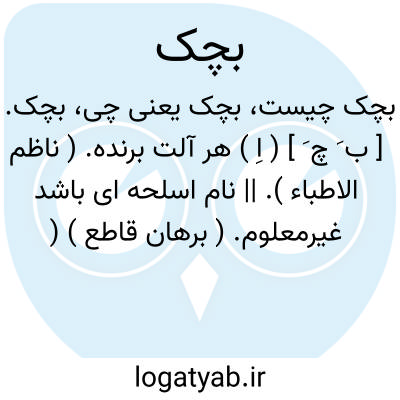 بچک. [ ب َ چ َ ] ( اِ ) هر آلت برنده. ( ناظم الاطباء ). || نام اسلحه ای باشد غیرمعلوم. ( برهان قاطع ) ( آنندراج ). نوعی سلاح. ( فرهنگ شعوری ج 1 ورق 172 ). یک نوع سلاح. ( ناظم الاطباء ). قسمی اسلحه که ترکان استعمال میکرده اند. ( فرهنگ نظام ). احتمالاً باید صورتی باشد از بچاق بمعنی چاقو: