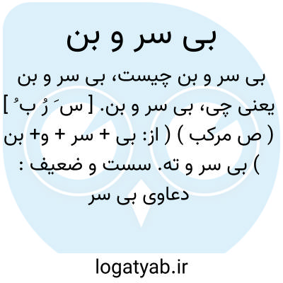 بی سر و بن. [ س َ رُ ب ُ ] ( ص مرکب ) ( از: بی + سر + و+ بن ) بی سر و ته. سست و ضعیف: دعاوی بی سر و بن. ( یادداشت مؤلف ). || دور و دراز.بی سر و ته. بی کران. نامتناهی. نامعلوم: همچنان پیاده در کوهها و بیابانها بی سر و بن میگشت و بر گناهان خود نوحه میکرد. ( تذکرةالاولیاء عطار ).
